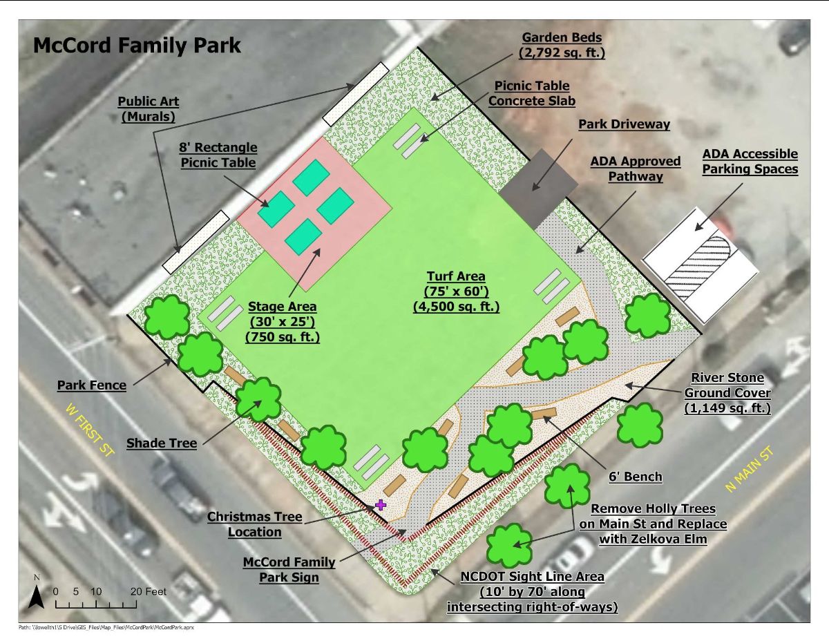 Lowell City Manager Scott Attaway described plans for the park this way: “The City of Lowell is excited for this new open space park that will feature a walking path, benches, picnic tables, and a small shade structure that will double as a performance venue as well as a picnic shelter. It will be a great outdoor spot for downtown visitors and local business employees to enjoy their lunch breaks, and this park will serve as a great programming space for small concerts, art festivals, outdoor fitness classes, and of course the home of the City’s Christmas Tree!”